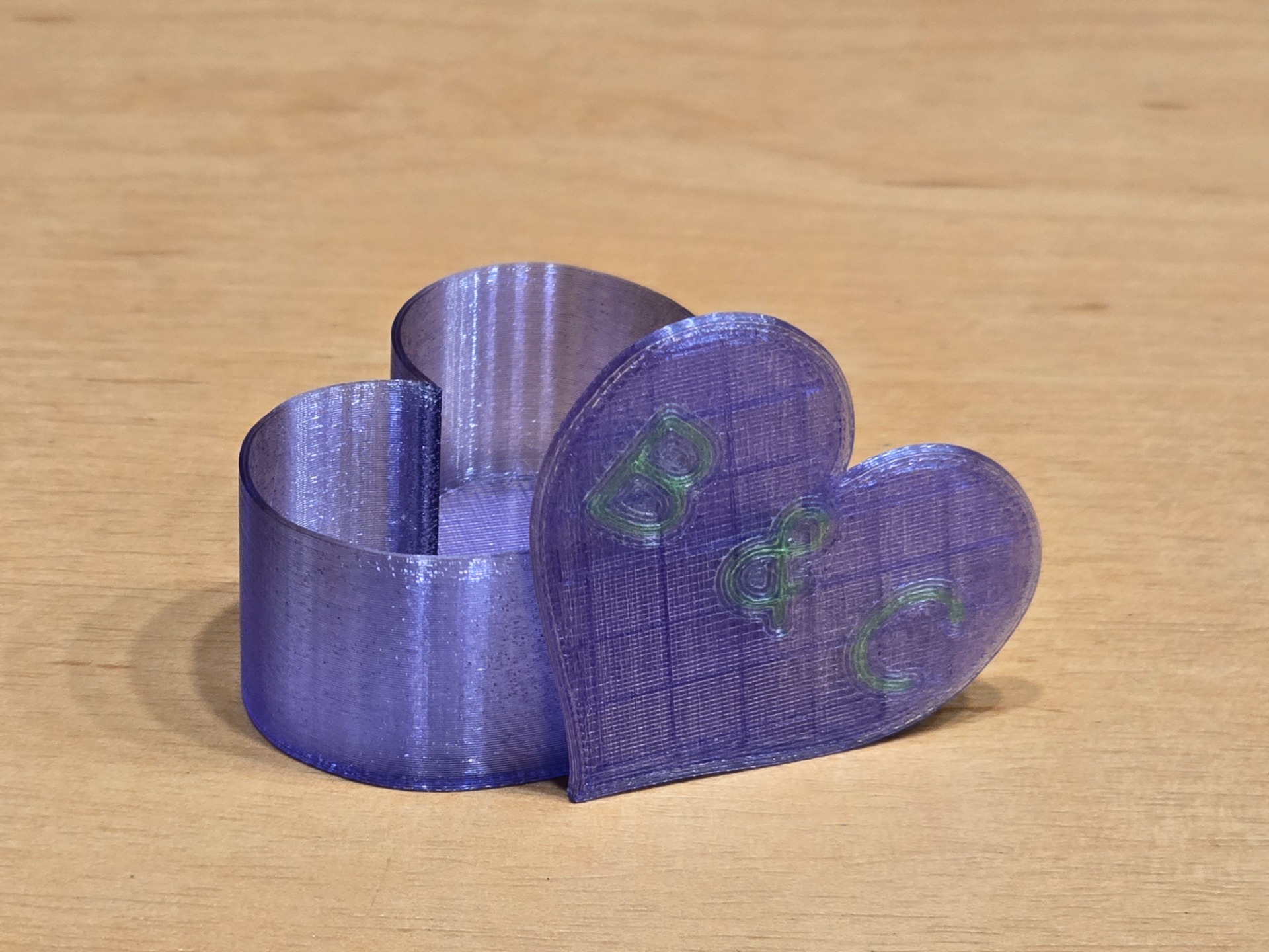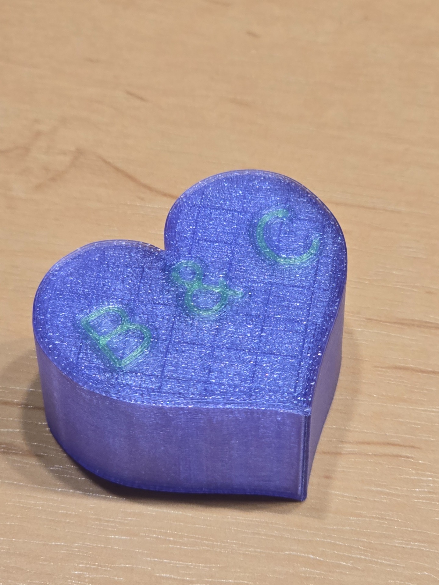 Herzförmige Geschenkdose mit abnehmbarem Deckel. In diesen können Buchstaben und Zahlen eingedruckt werden. Die Farbe ist wählbar. Hier wurde transparentes Filament verwendet. Größe auf dem Foto: 40x40x20mm