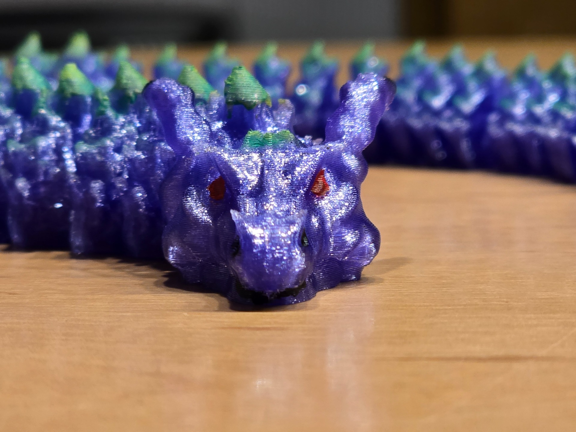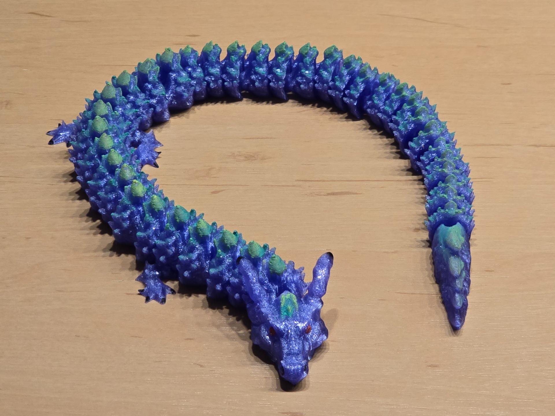 Der Drache wurde an einem Stück mit transparentem Lila PLA Filament gedruckt und anschließend bemalt. Er ist 41 cm lang.