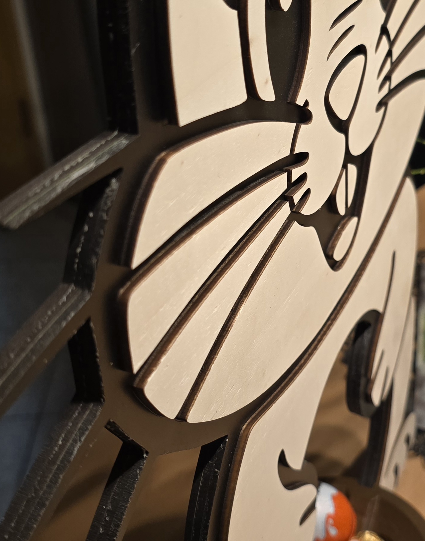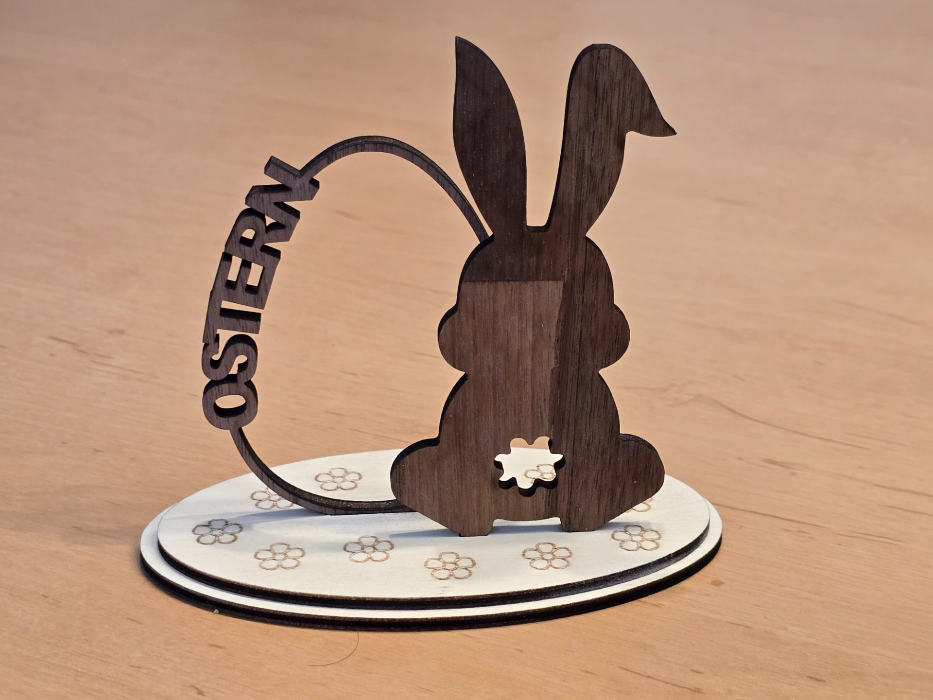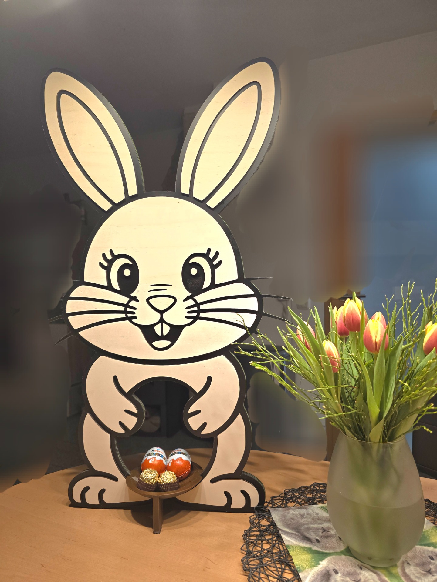 Riesen-Osterhase (hier ca. 80 cm) aus mehreren Holzschichten ausgeschnitten und verklebt. Das kleine Osternest wurde im 3D Drucker hergestellt und eingeklebt. Es dient gleichzeitig zur Standfestigkeit des Hasen.