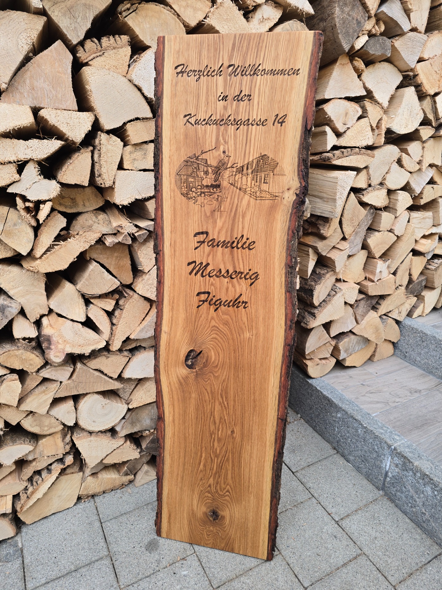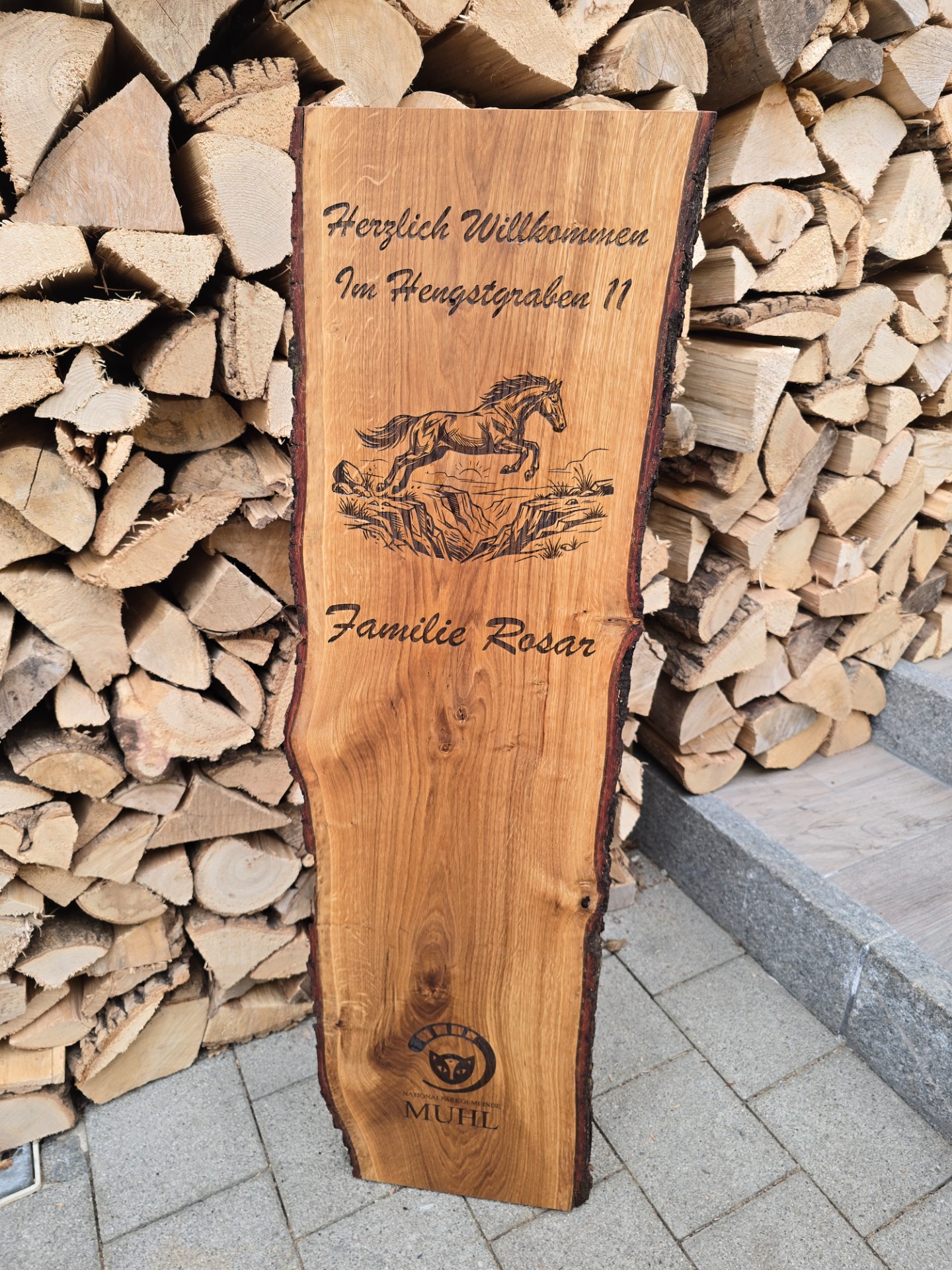 Die Haustüraufsteller wurden aus massivem Eichenholz gefertigt. Das unbesäumte Brett ist gehobelt und geschliffen. Die Gravuren darauf können nach Ihren individuellen Wünschen gefertigt werden. Die Oberfläche wurde mit Leinöl behandelt.