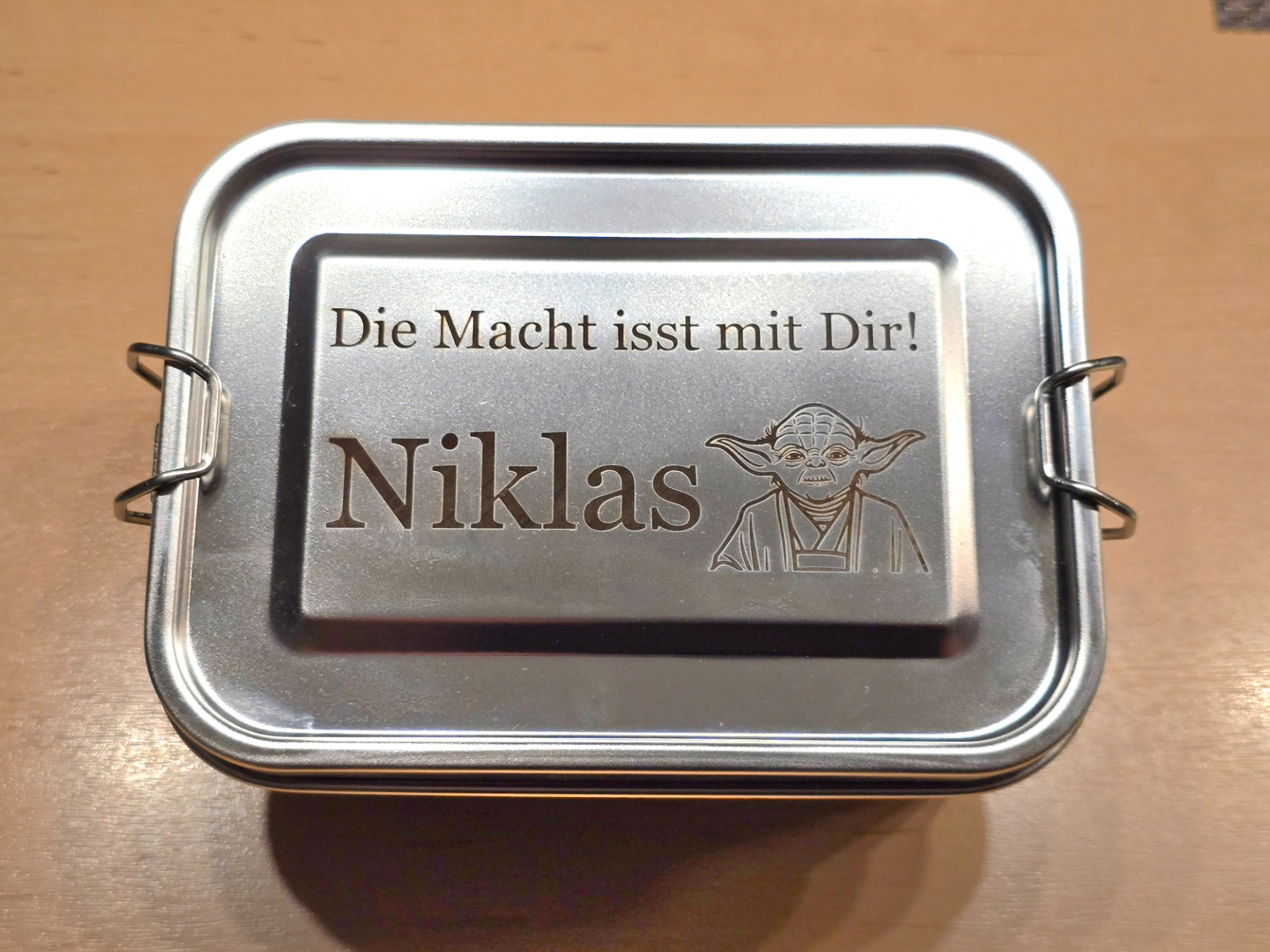Hier wurde die Kinderbrotzzeitdose aus Edelstahl ganz nach den Wünschen von Niklas lasergraviert.