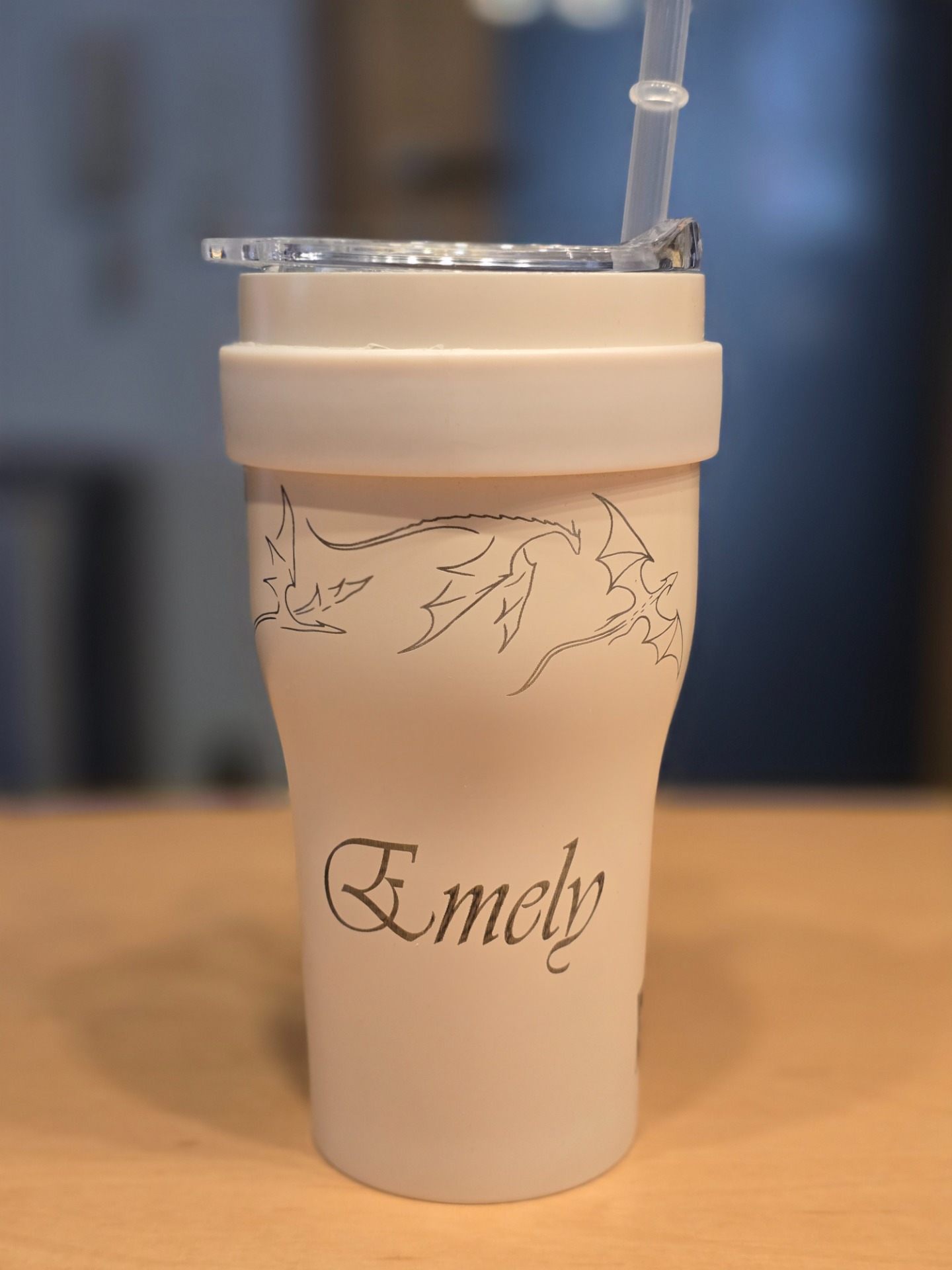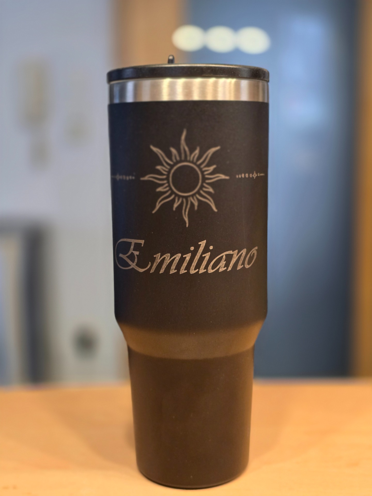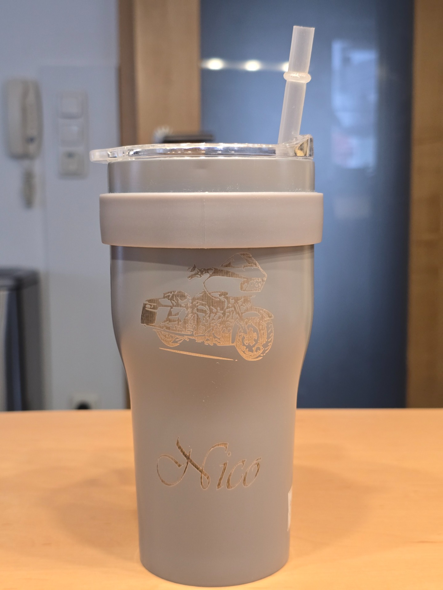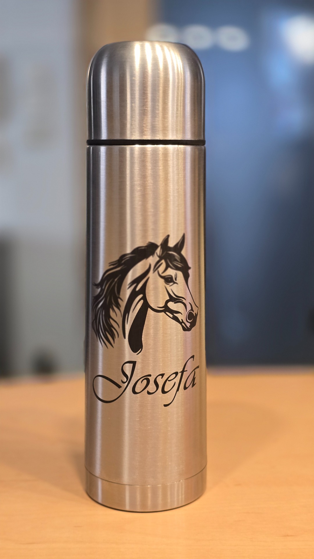 Hier wurde eine Edelstahl Thermosflasche zunächst schwarz lackiert. Anschließend wurde die Wunschgravur eingelasert und abschließend wurde Klarlack aufgetragen.