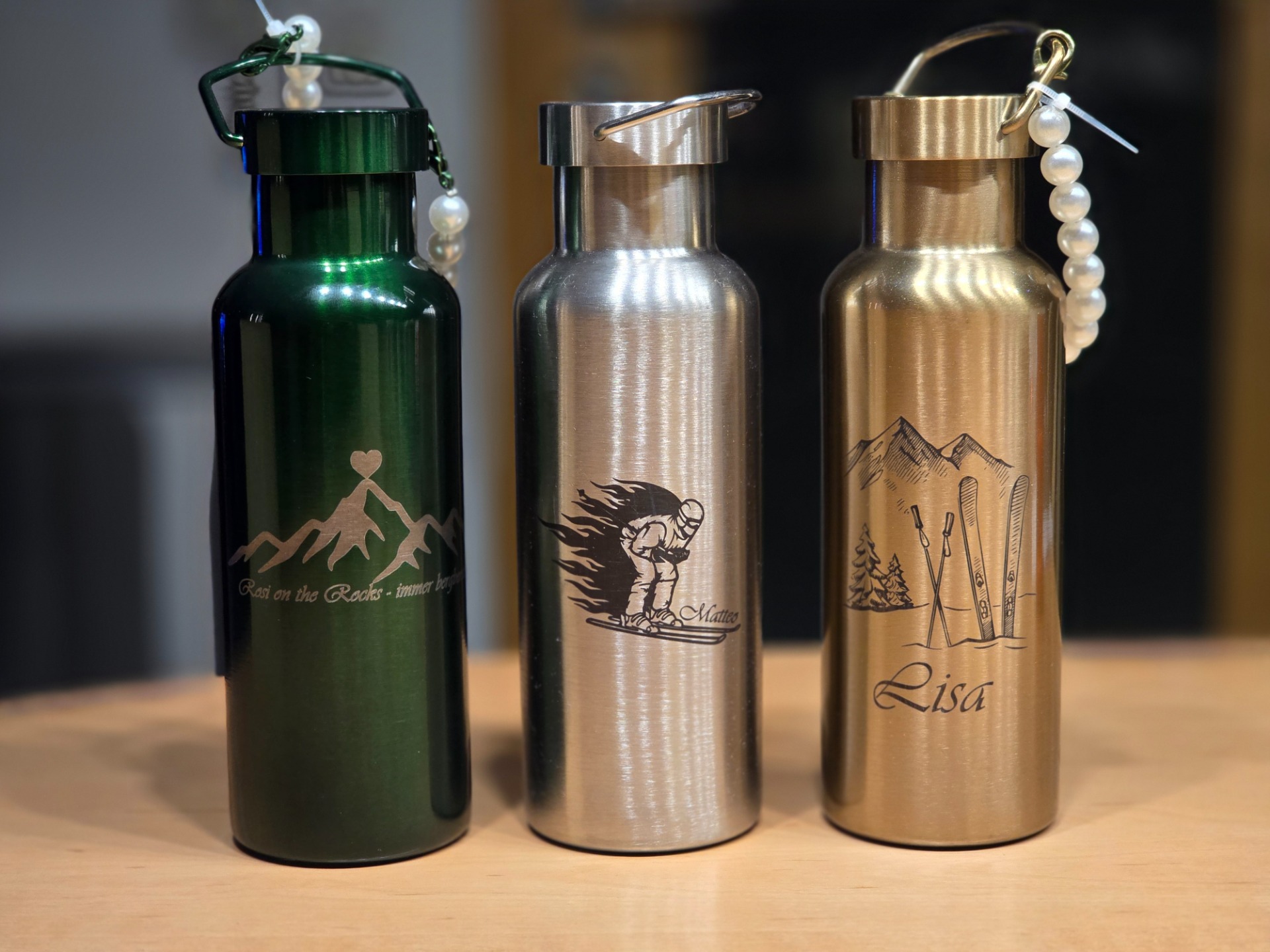 Grundsätzlich kann jede Art von Edelstahlflaschen graviert werden. Bei Flaschen ohne Beschichtung wird eine schwarze Gravur aufgebracht. Bei Flaschen mit Beschichtung wird diese weggelasert und darunter erscheint das silberfarbige Metall.