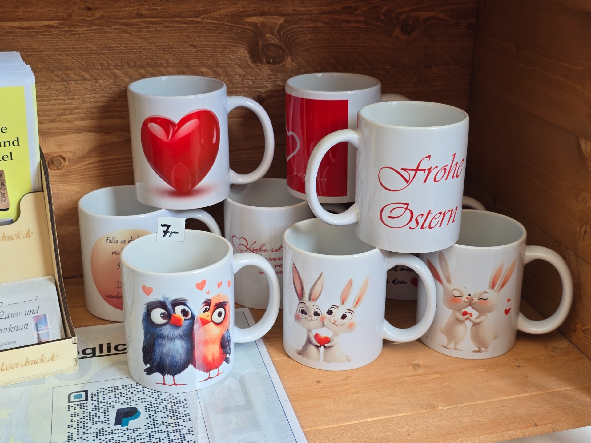 Bald ist wieder Valentinstag. Dazu wäre doch eine passende Tasse ein guter Geschenkvorschlag. Hier sehen sie ein paar von mir produzierte Vorschläge. Gerne nehme ich auch individuelle Wünsche an. Als Basistassen sind auch andere Farben möglich.