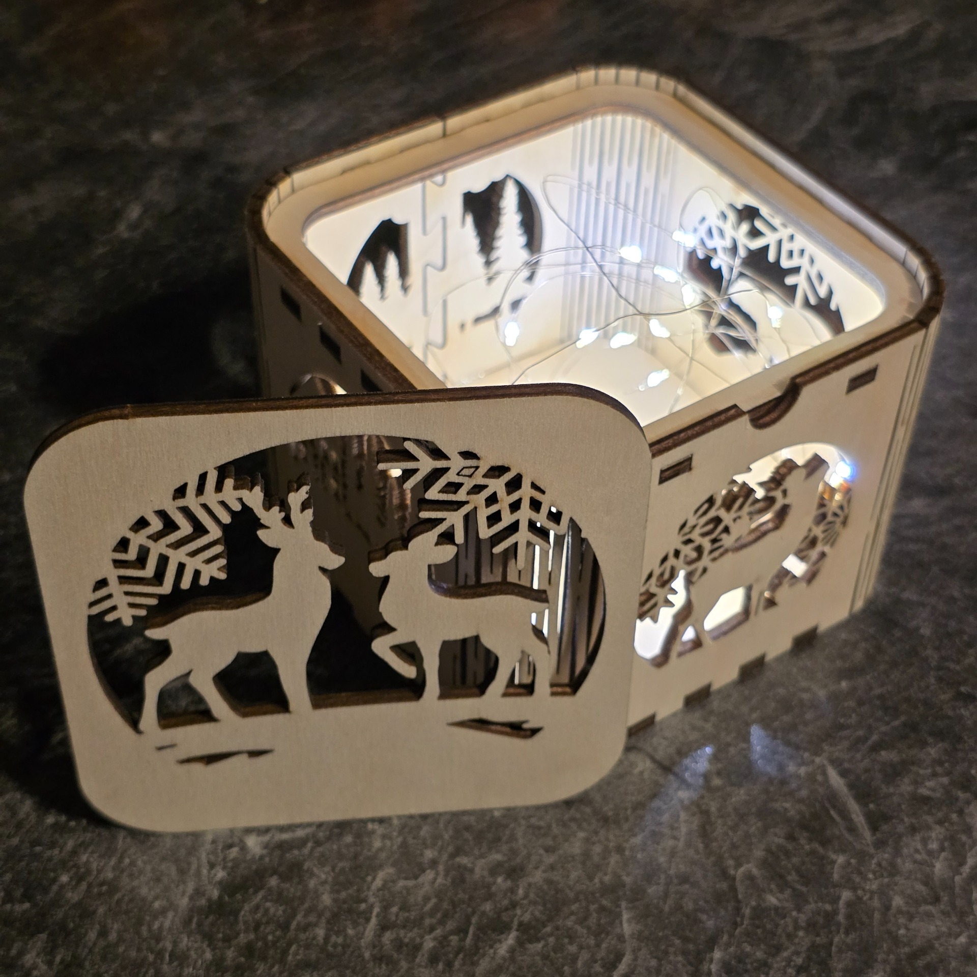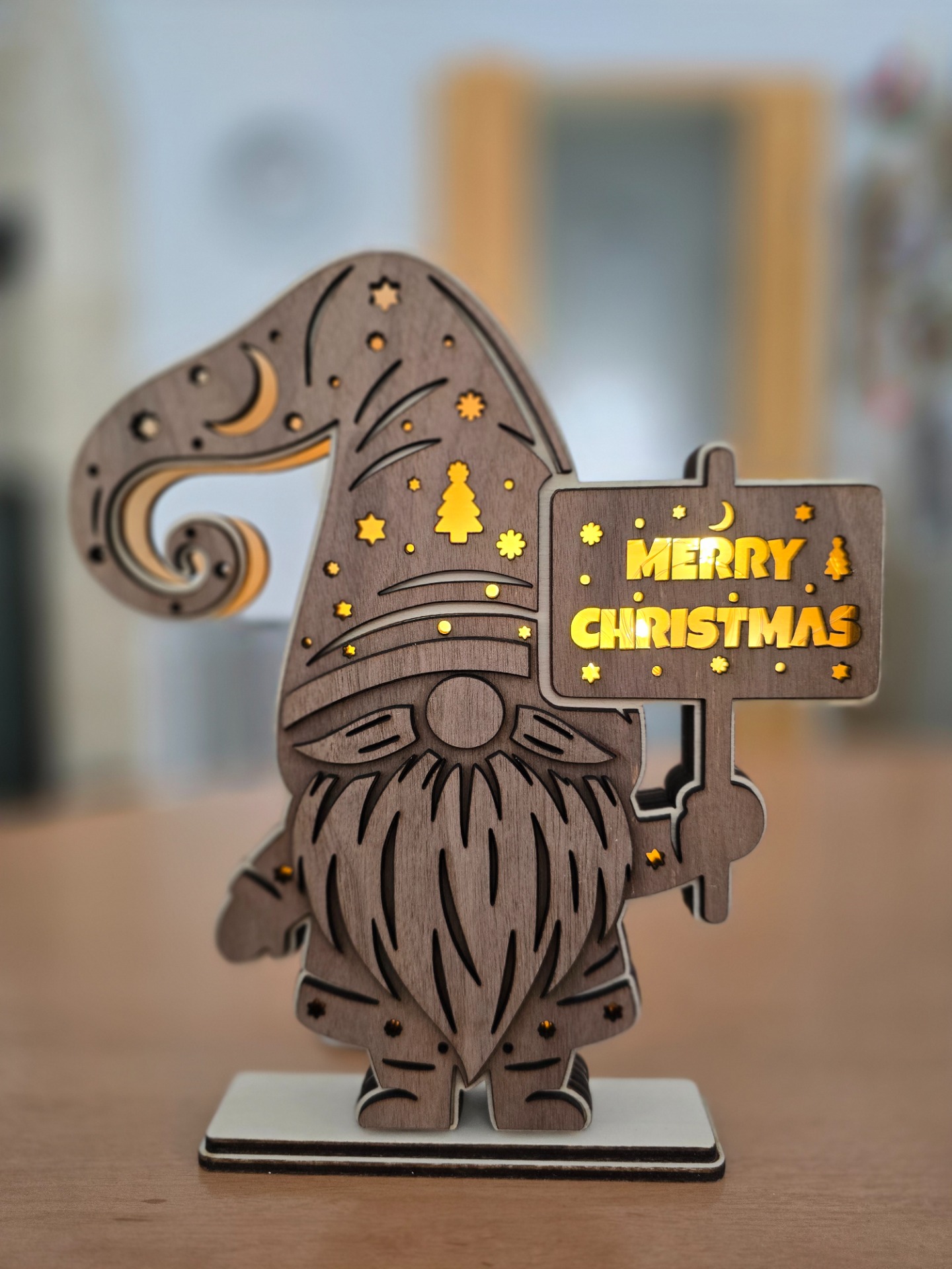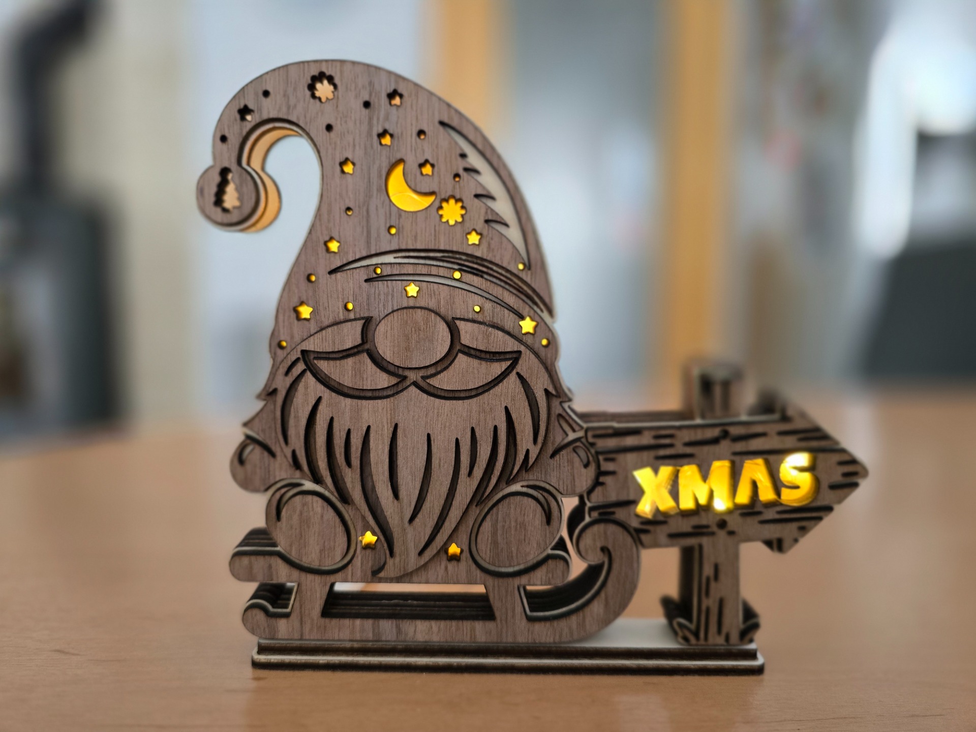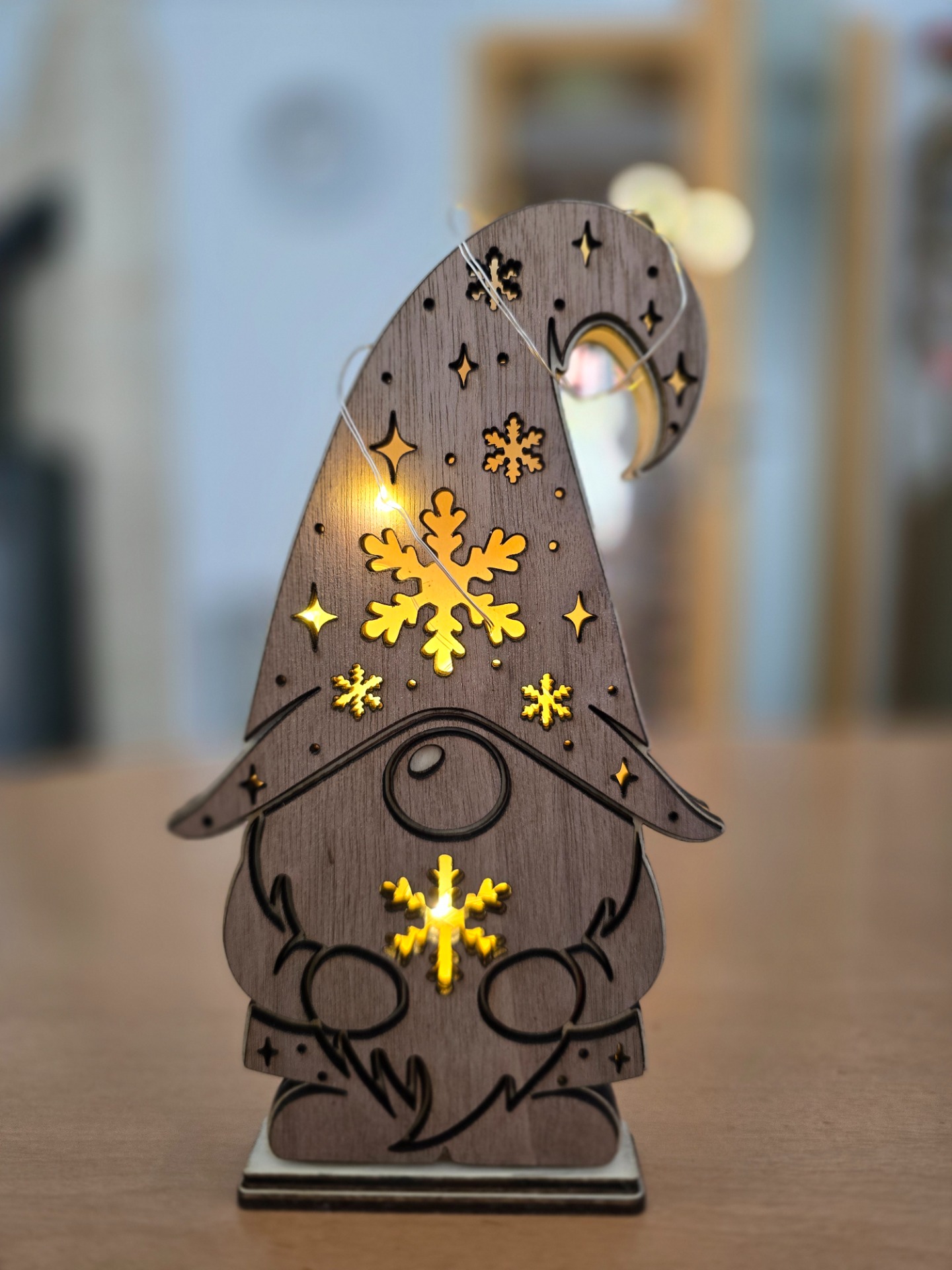 Die Wichtel werden aus unterschiedlichen Sperrholzarten (Pappel/Nussbaum) ausgelasert und verleimt. Anschließend wird eine kleine Batterielichterkette eingeschoben.