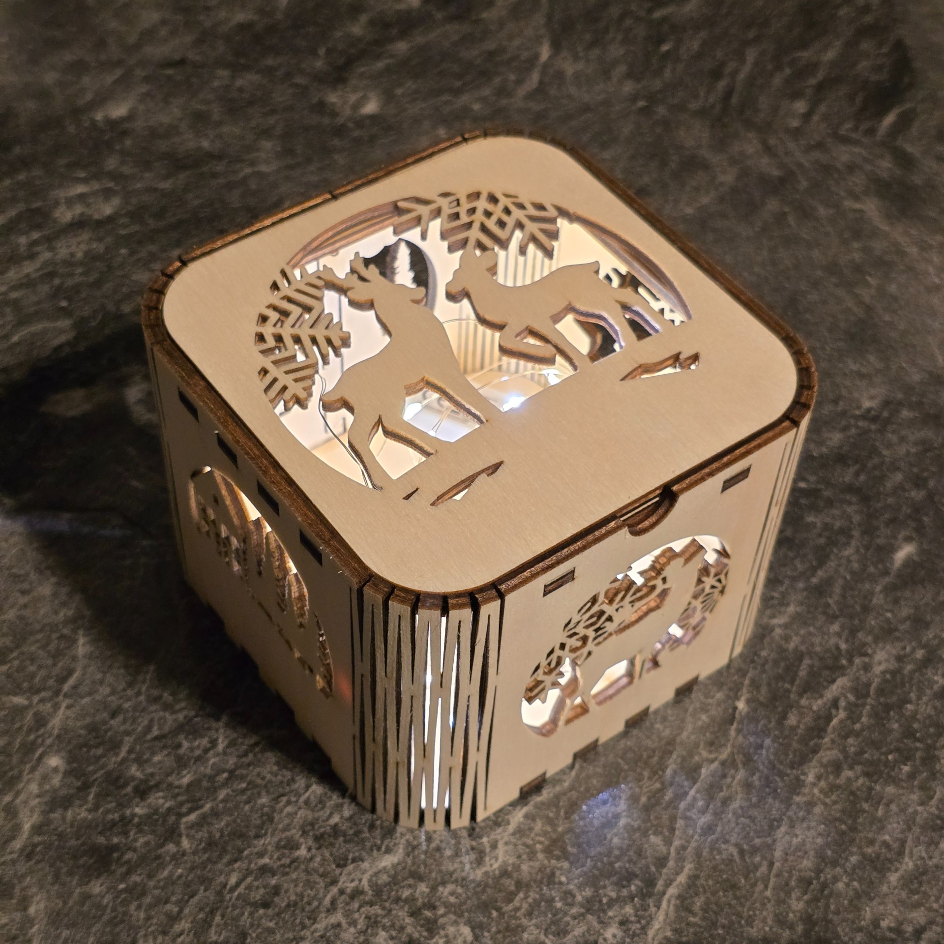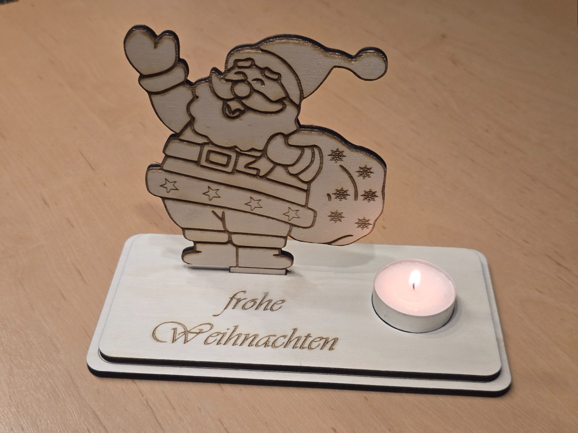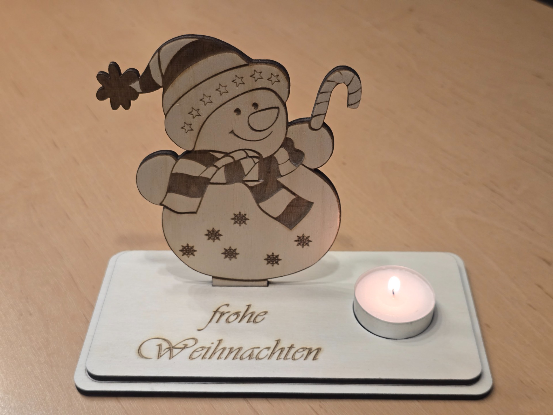 Die Teelichthalter werden, je nach Wunsch, aus Pappel-, Nussbaum- oder auch aus gemischten Sperrholzplatten gelasert.