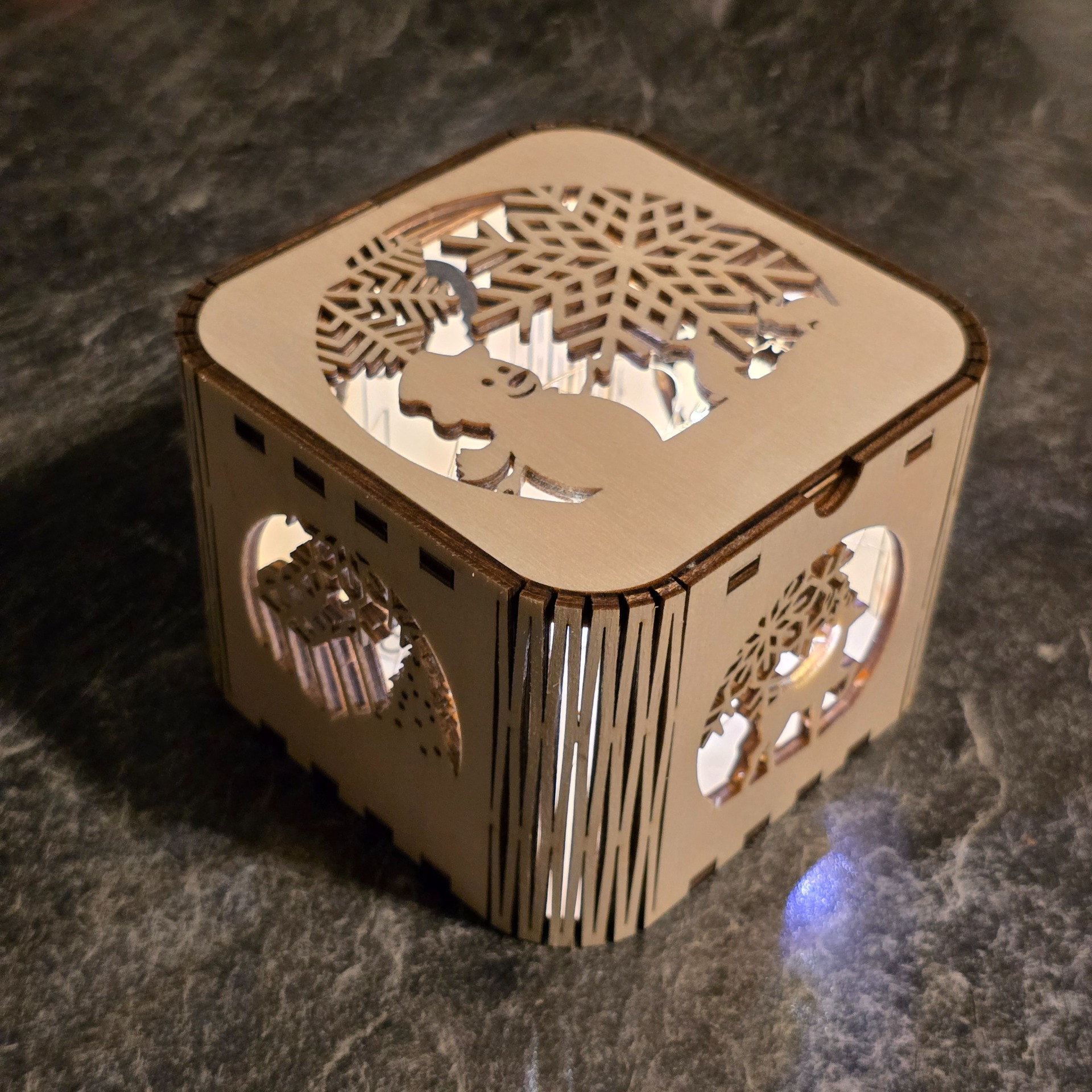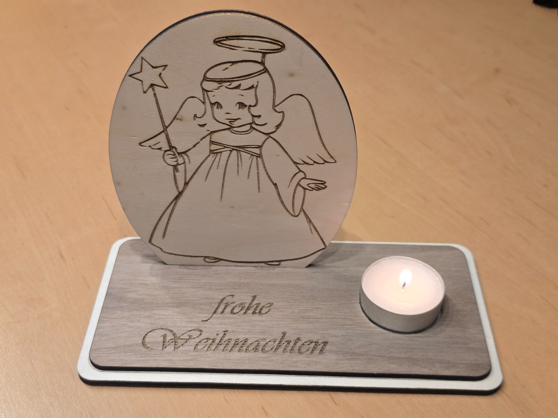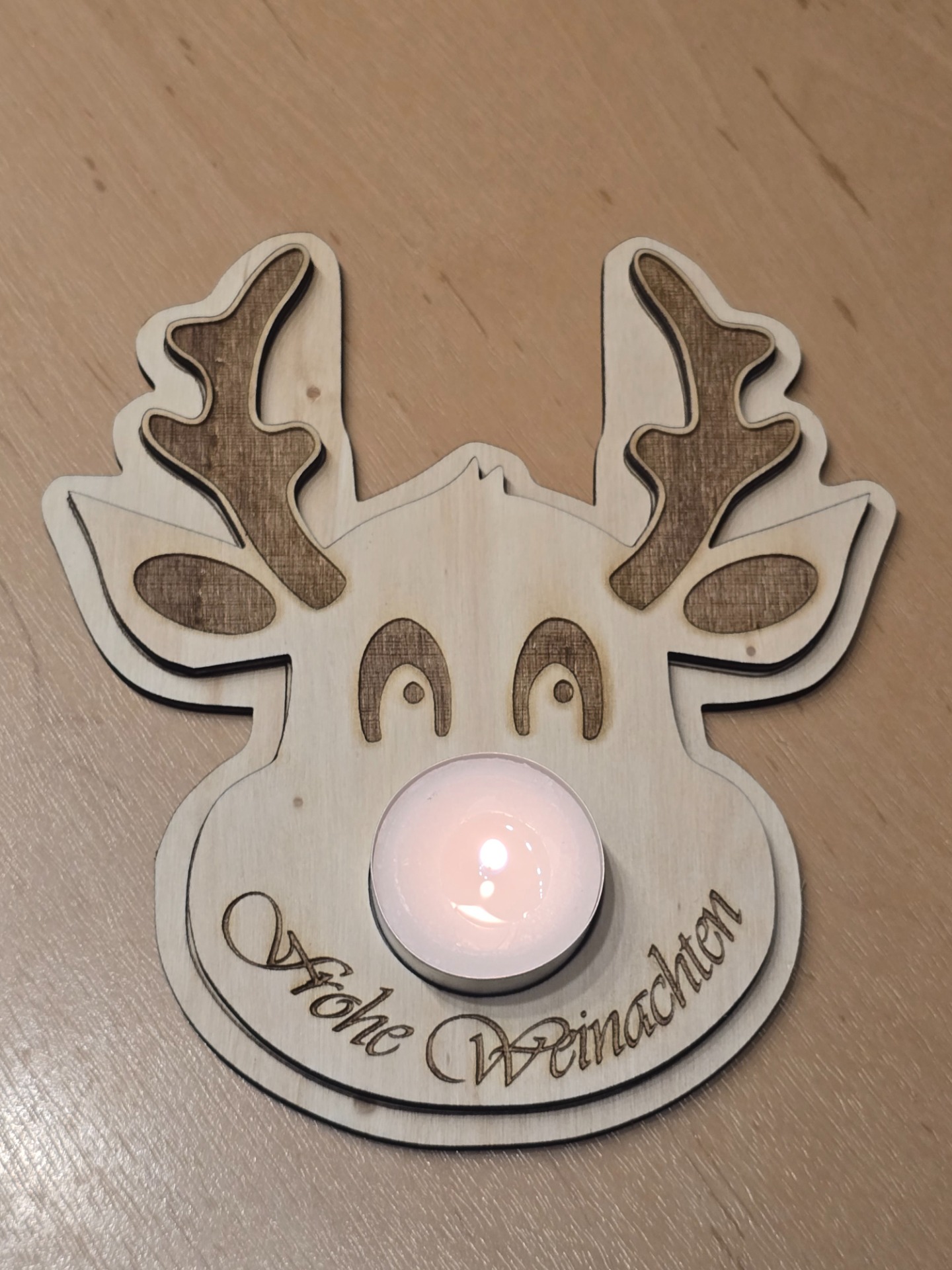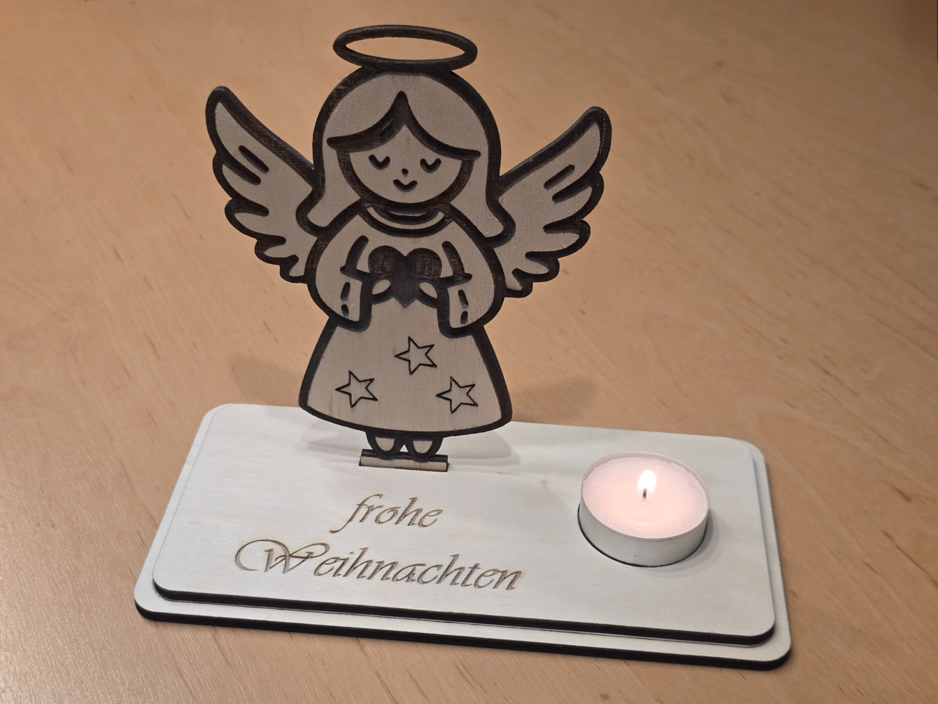 Die Teelichthalter werden, je nach Wunsch, aus Pappel-, Nussbaum- oder auch aus gemischten Sperrholzplatten gelasert.